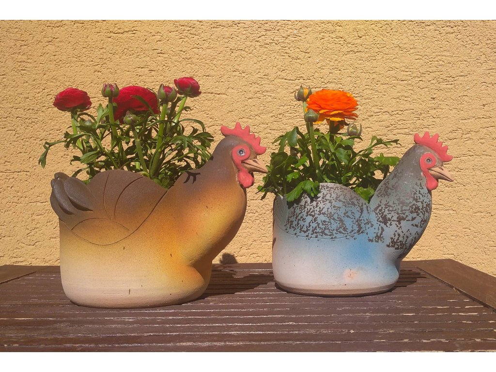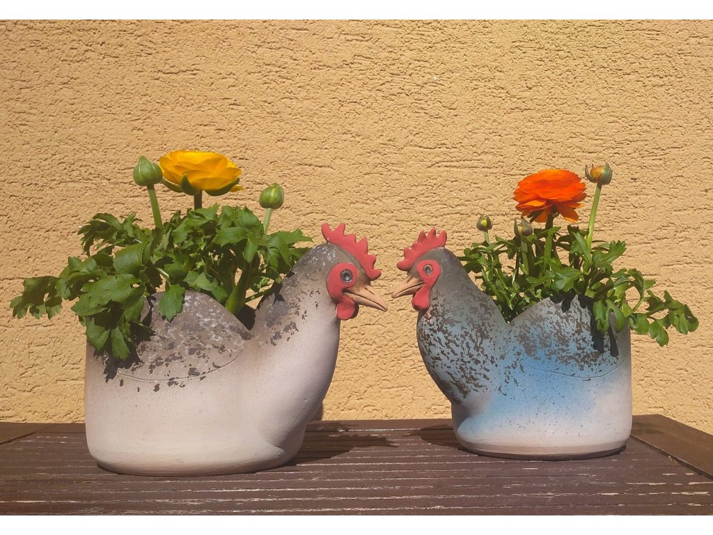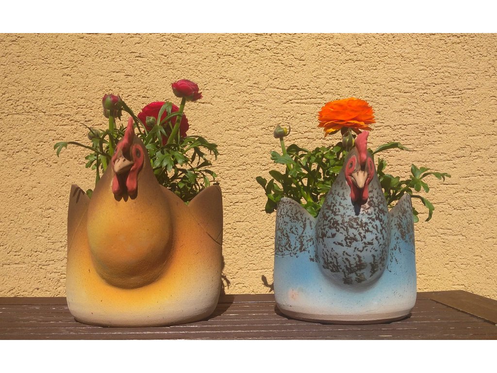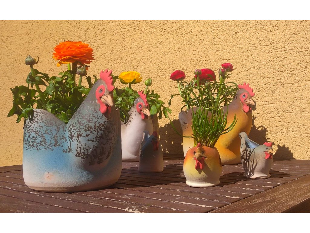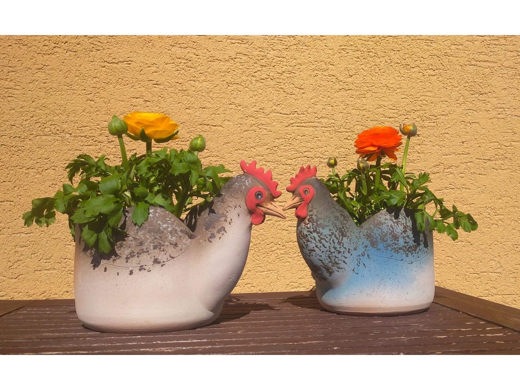 Modrá slepička, výška 15 cm k hřebínku. Rovný květináč, do kterého lze zasadit i živé květiny, odolá vodě i slunci. Originální dekorace domů i na zahradu.